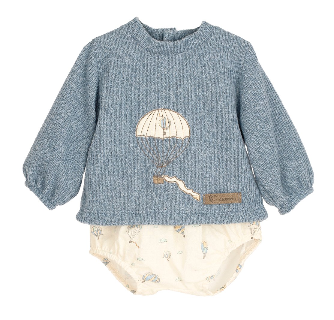 Conjunto pololo Anemoi de bebé niño, formado por jersey en celeste con dibujo de globo y ranita a juego de la colección Otoño-Invierno 2025/2026 de Calamaro Baby