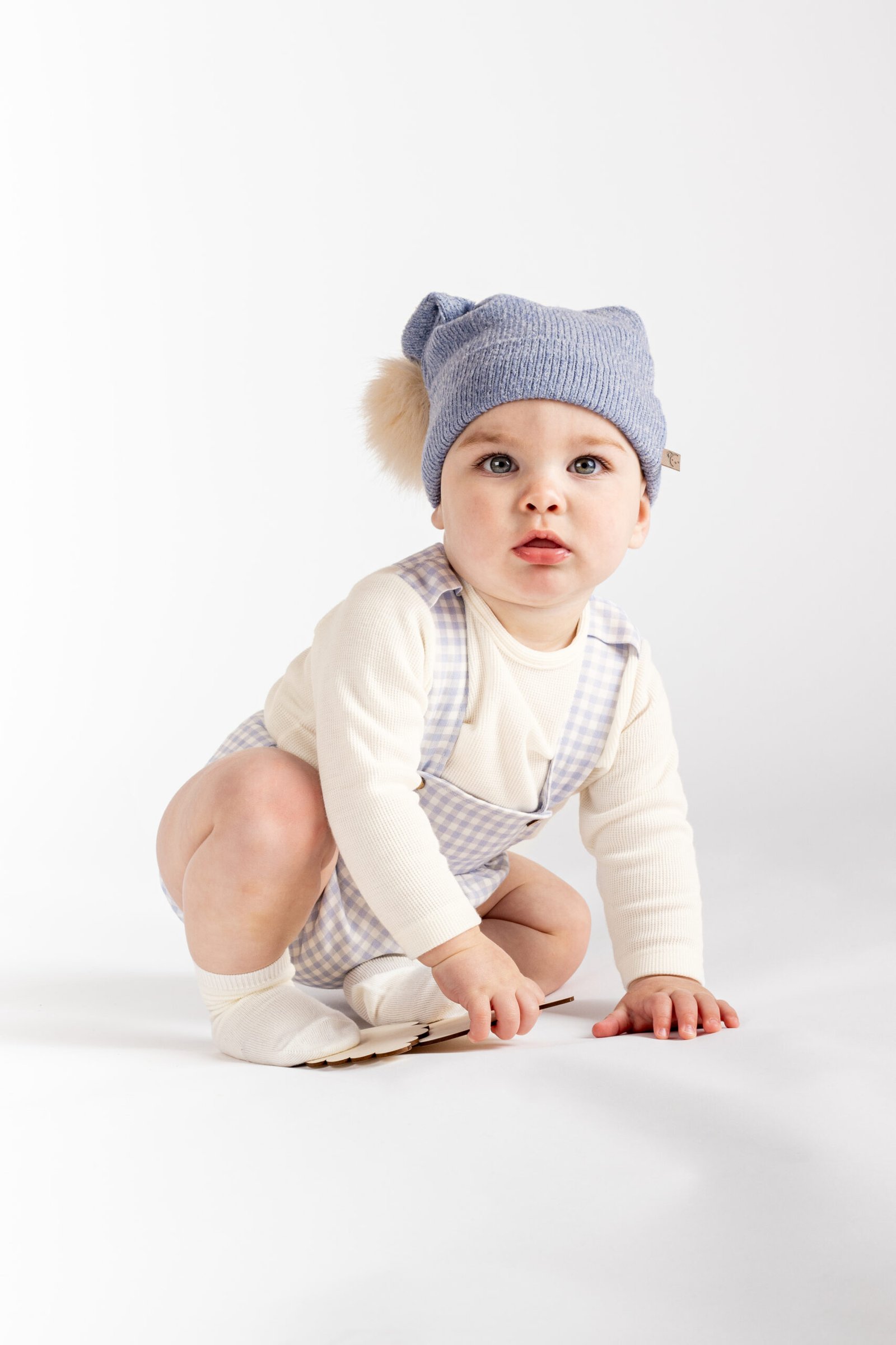 Conjunto pololo Berg de bebé niña, formado por jersey en crudo y peto de cuadros vichy en color auzl de la colección Otoño-Invierno 2025/2026 de Calamaro Baby