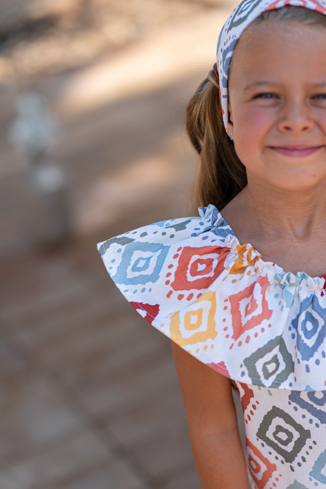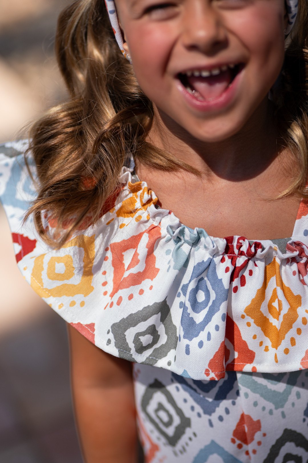 Mono infantil de estilo étnico con un precioso estampado geométrico en tonos suaves y cálidos. Destaca por su volante asimétrico, que aporta un toque original y elegante al diseño.