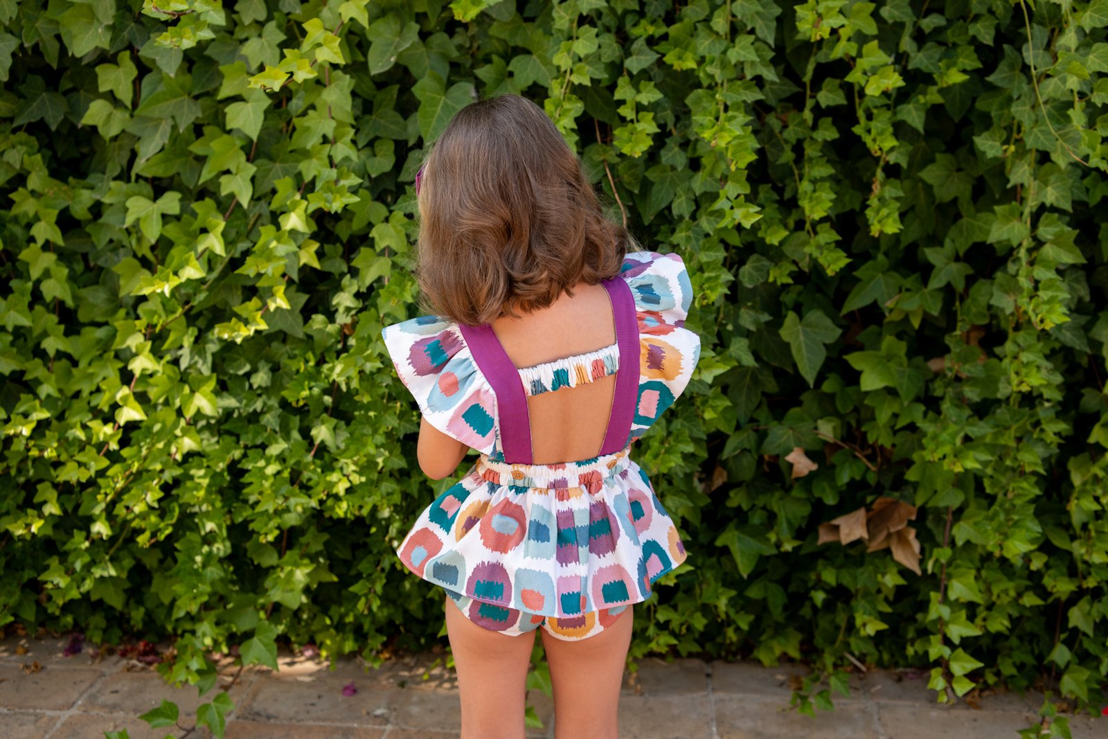 Peto corto de niña, con diseño manchas de colores rosa y verde de la colección Primavera-verano 2026 de José Varón.