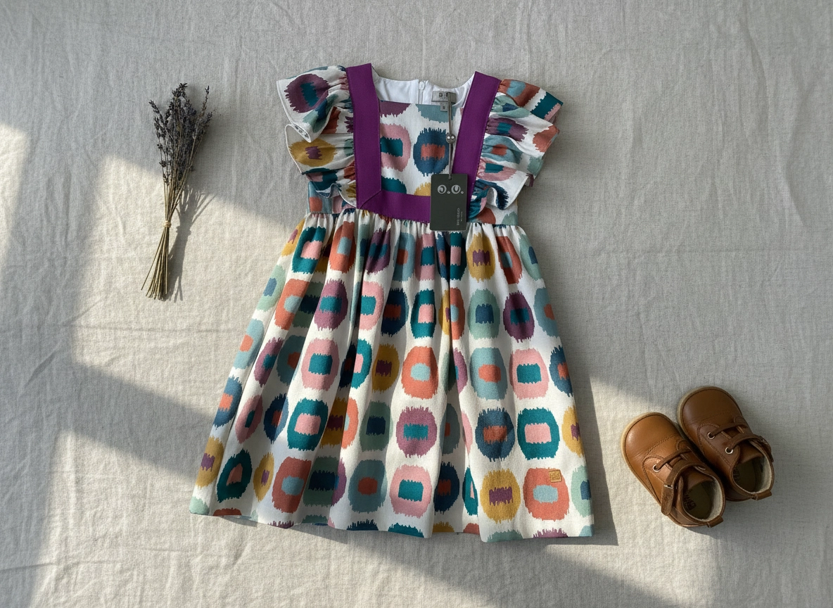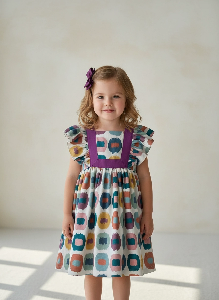 Vestido de niña, con diseño manchas de colores rosa y verde de la colección Primavera-verano 2026 de José Varón.