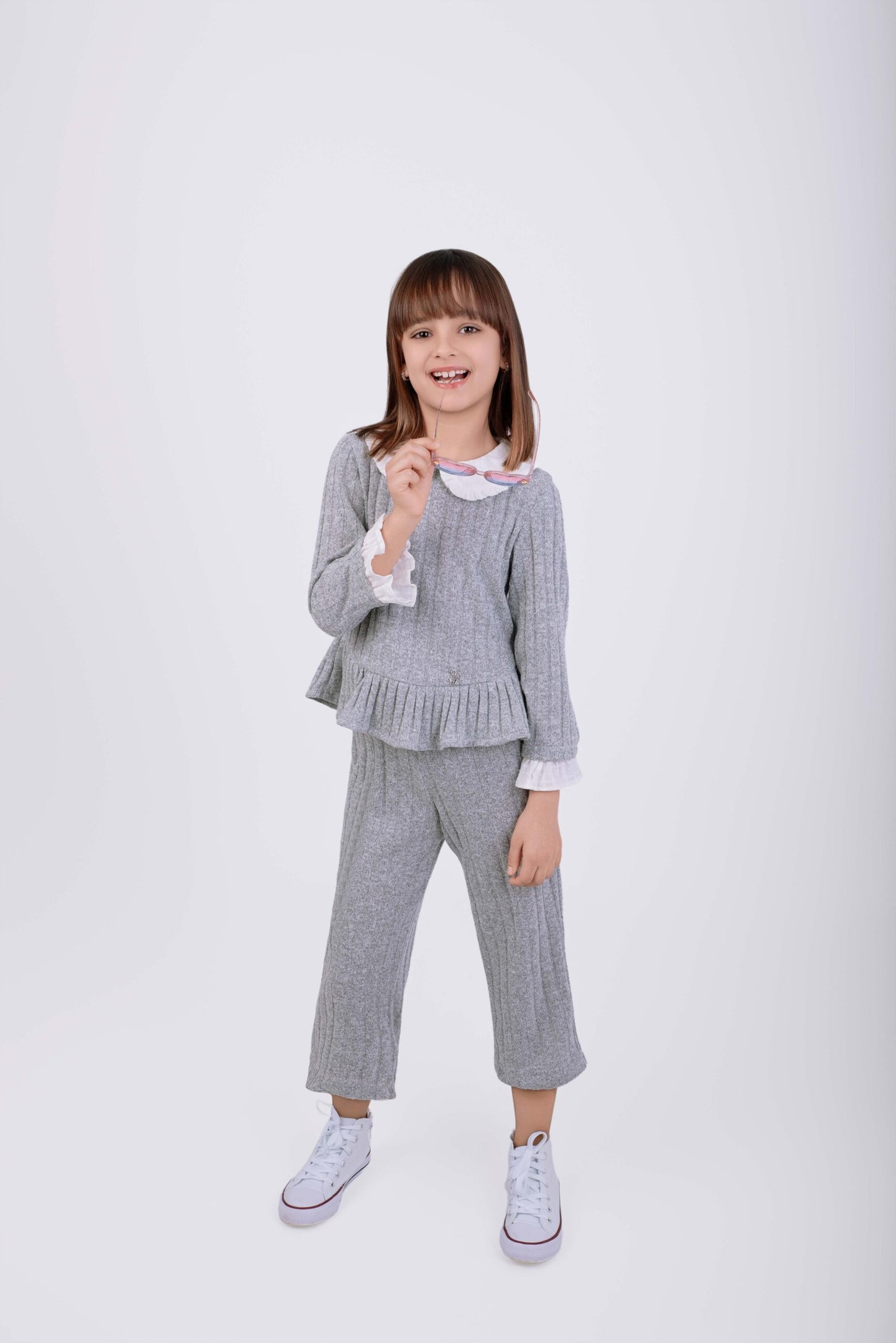 Conjunto de 2 piezas para niña de la marca Nekenia. Se compone de jersey de punto en color gris con cuello  en blanco y volantes en blanco en las mangas y pantalón de canalé en color gris.