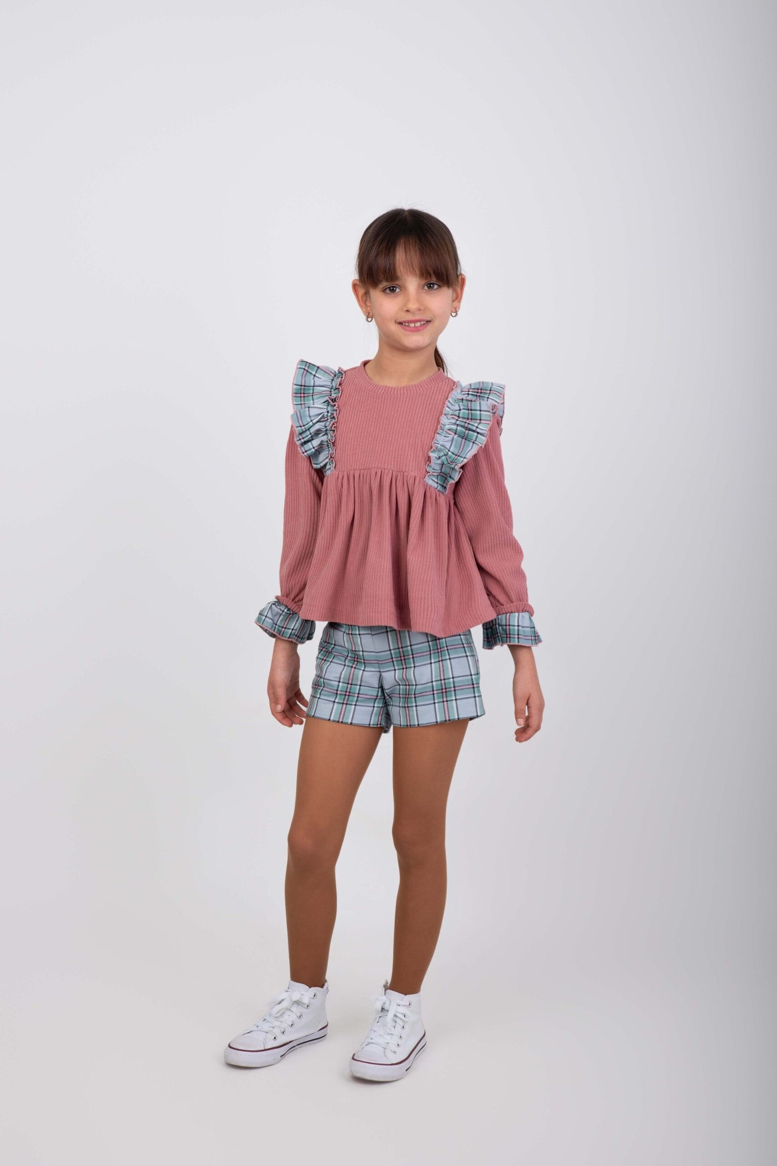 Conjunto de 2 piezas para niña de la marca Vera by Nekenia. Se compone de top pana punto en color rosa empolvado y volantes a los lados de cuadros a juego con el short de cuadros.