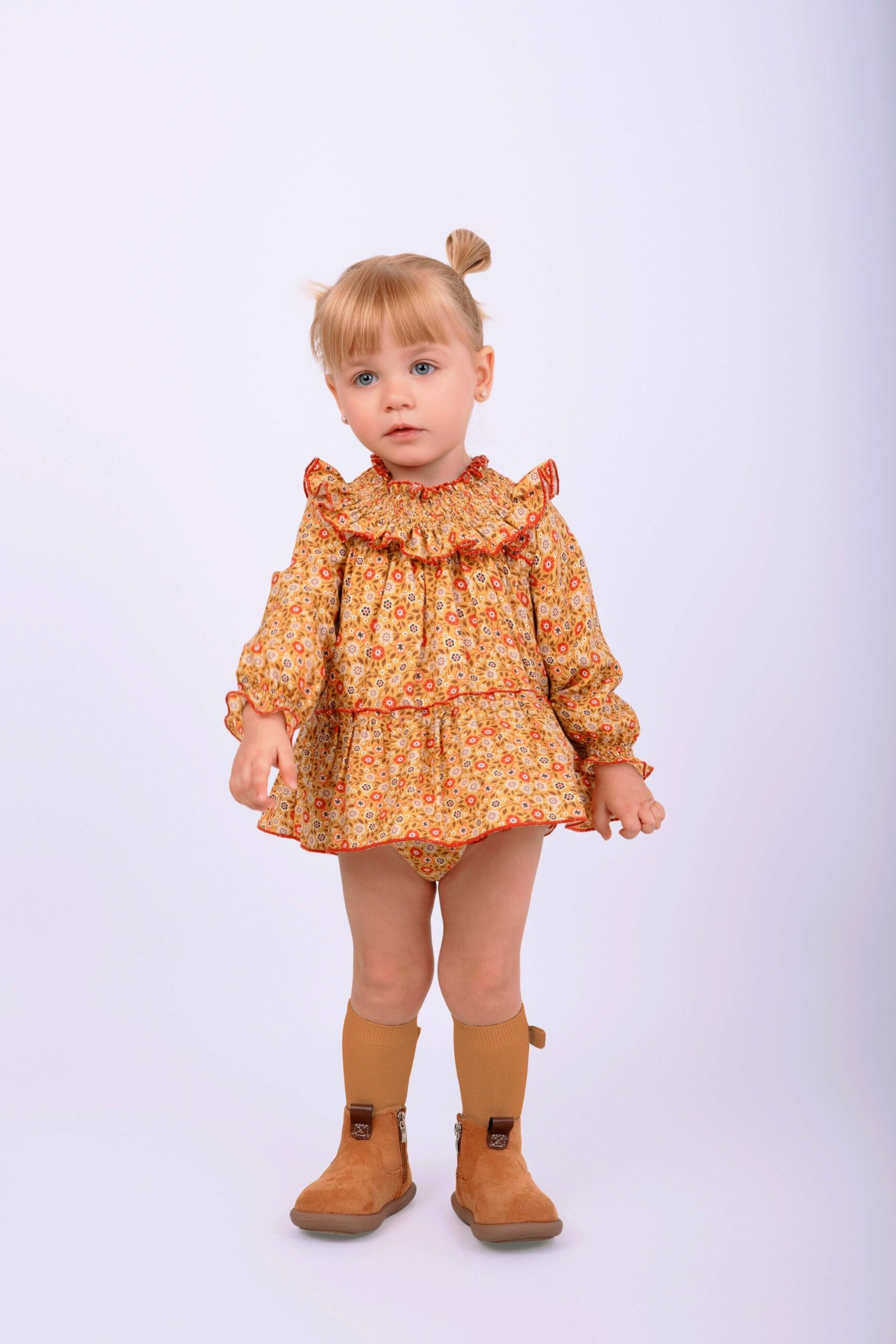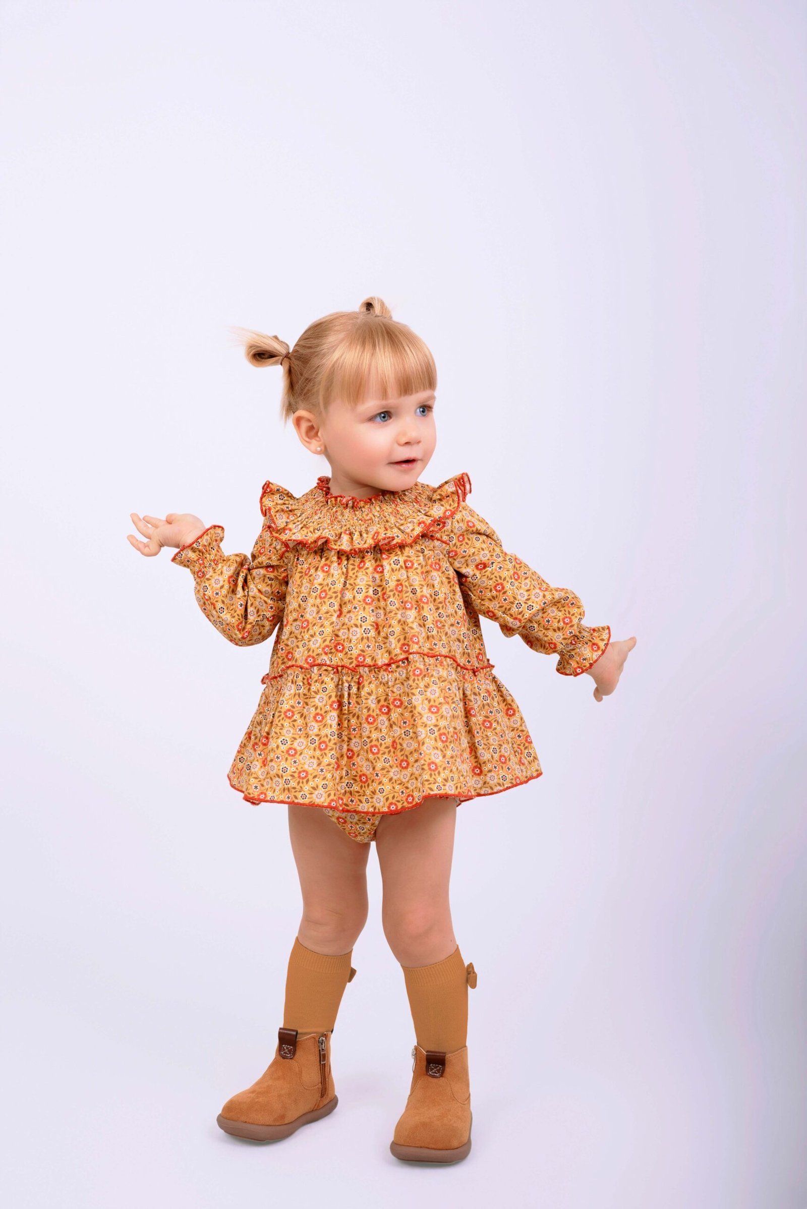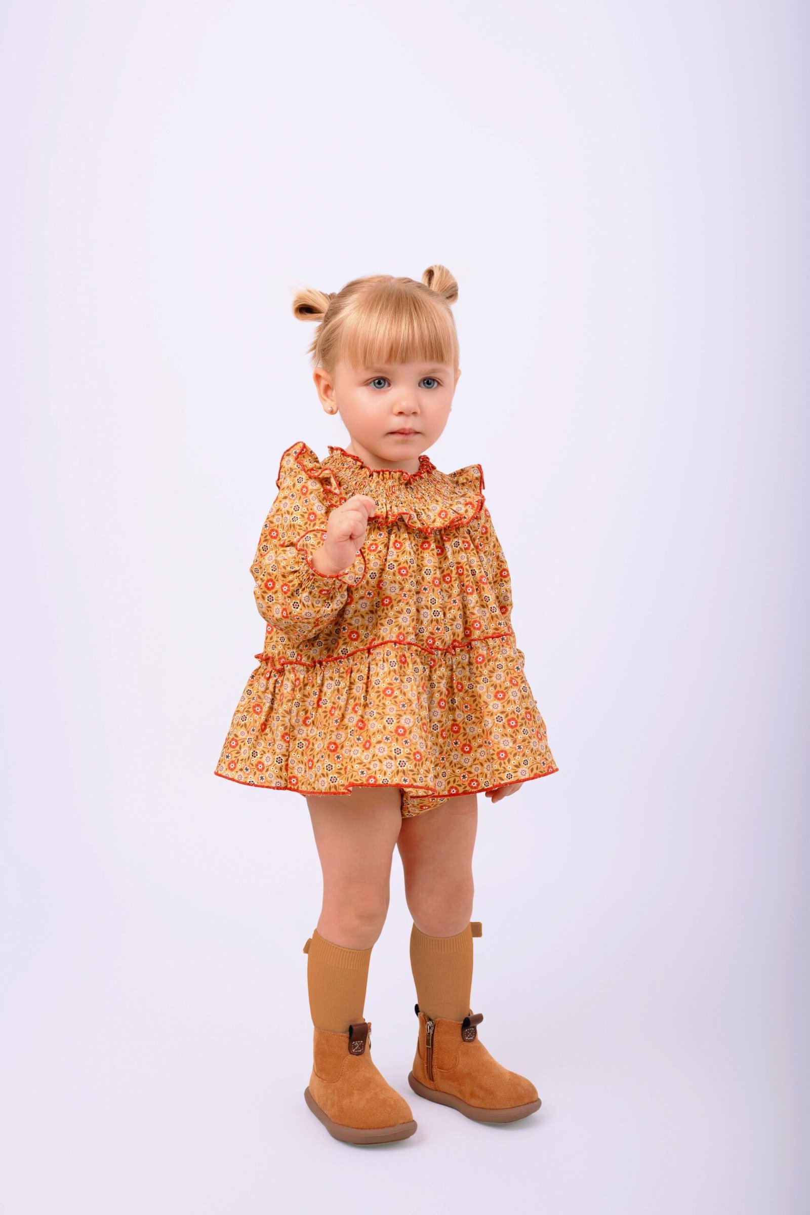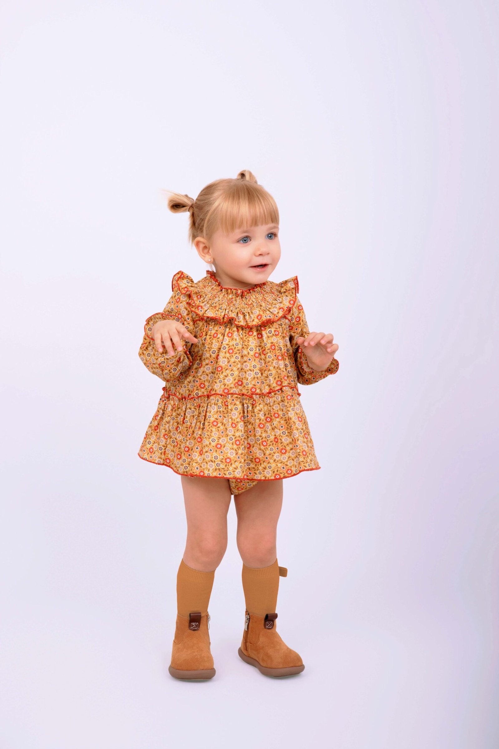 Vestido de bebé niña liberty en color mostaza con estampado de flores y cuello engomado y braguita a juego.