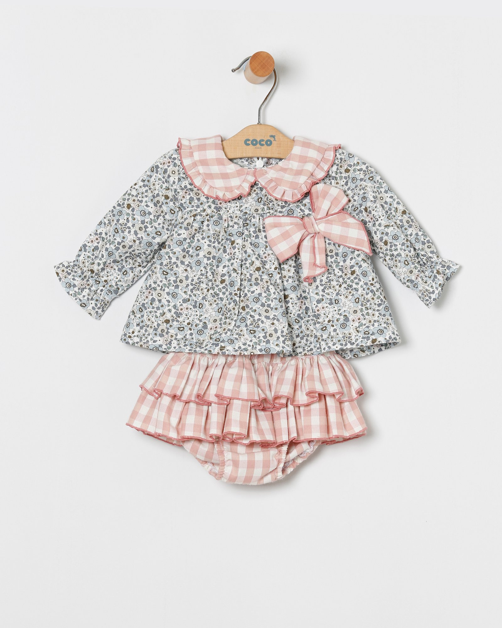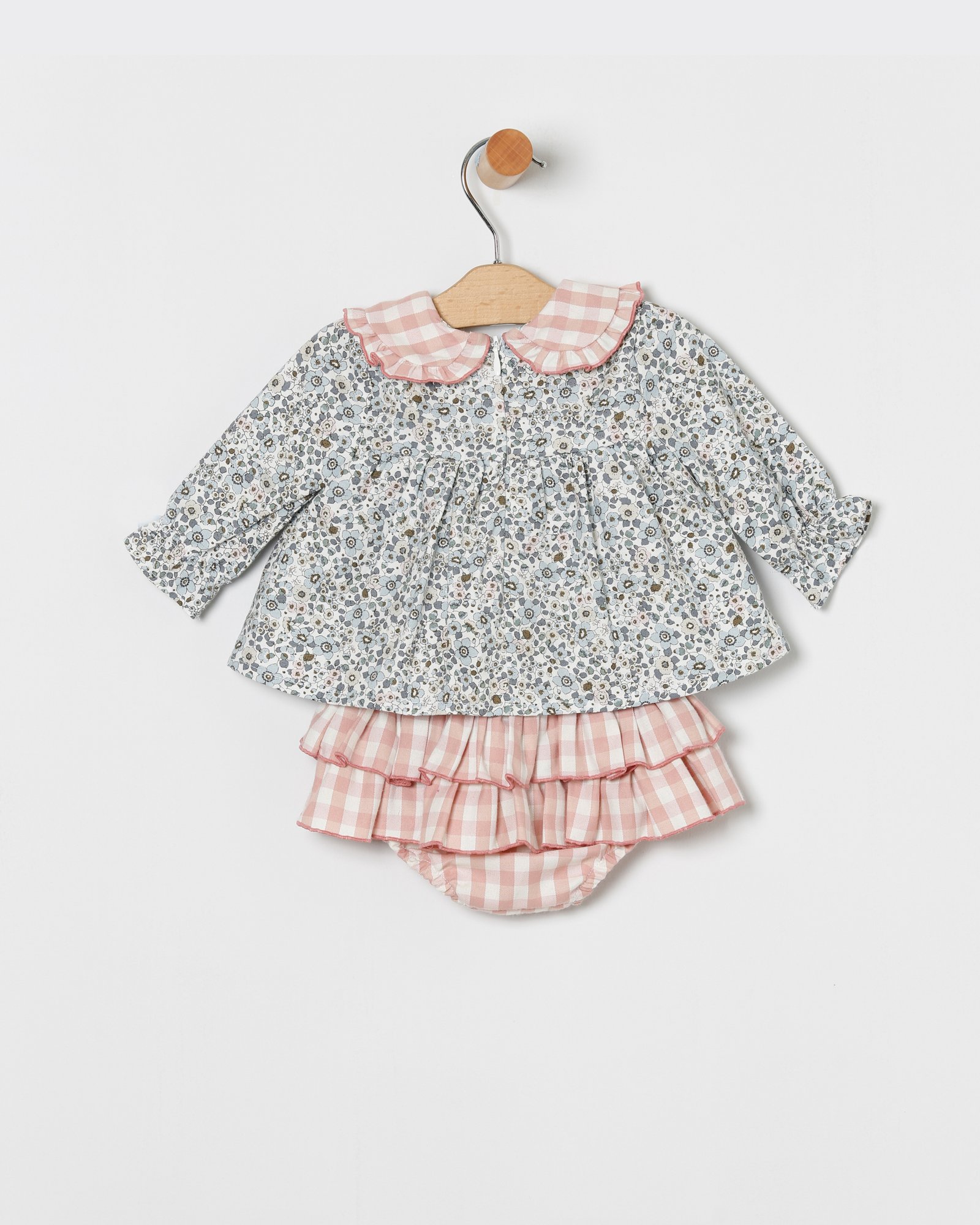 Conjunto de bebé formado por blusita estampada de flores en tonos azules y cuello de cuadros vichy en rosa y braguita de volantes a juego con el cuello de la colección de Otoño-invierno 2025-2026 de Coco Acqua.