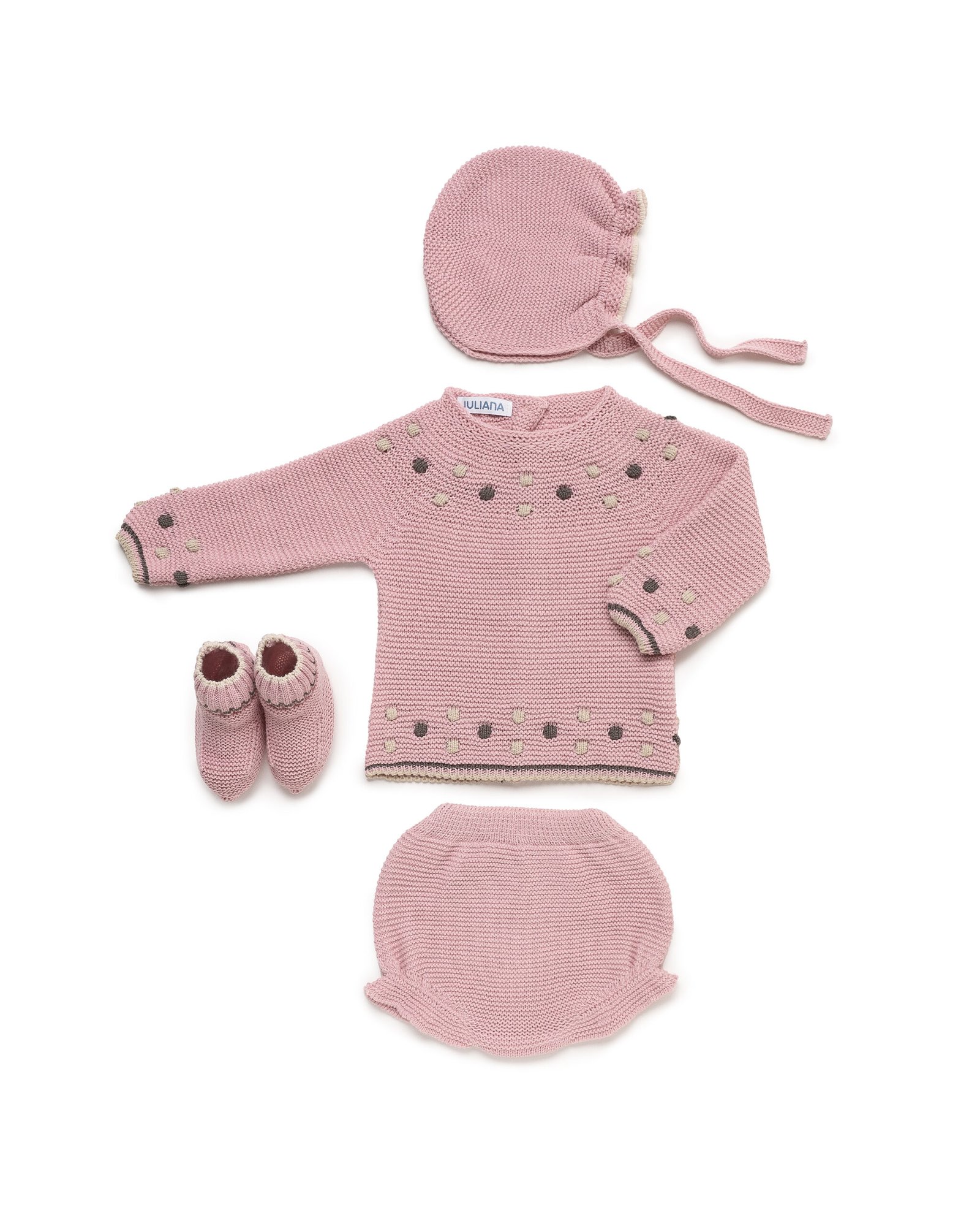 Conjunto de cuatro piezas: jersey con bodoques tejidos en relieve, ranita, gorro y botitas a conjunto. Color maquillaje/marengo  de la colección «serenata» de Otoño-Invierno 2025/2026 de Juliana Vistiendo Bebés.