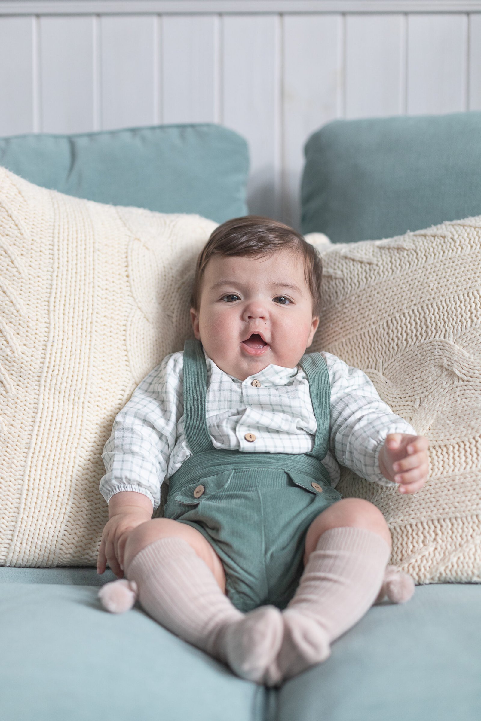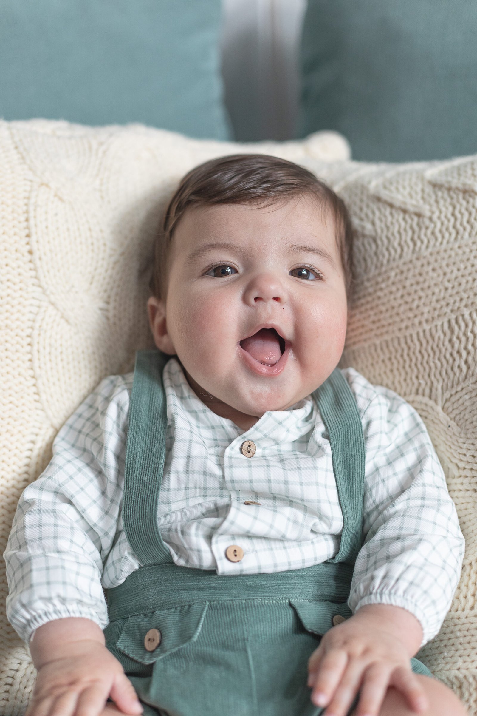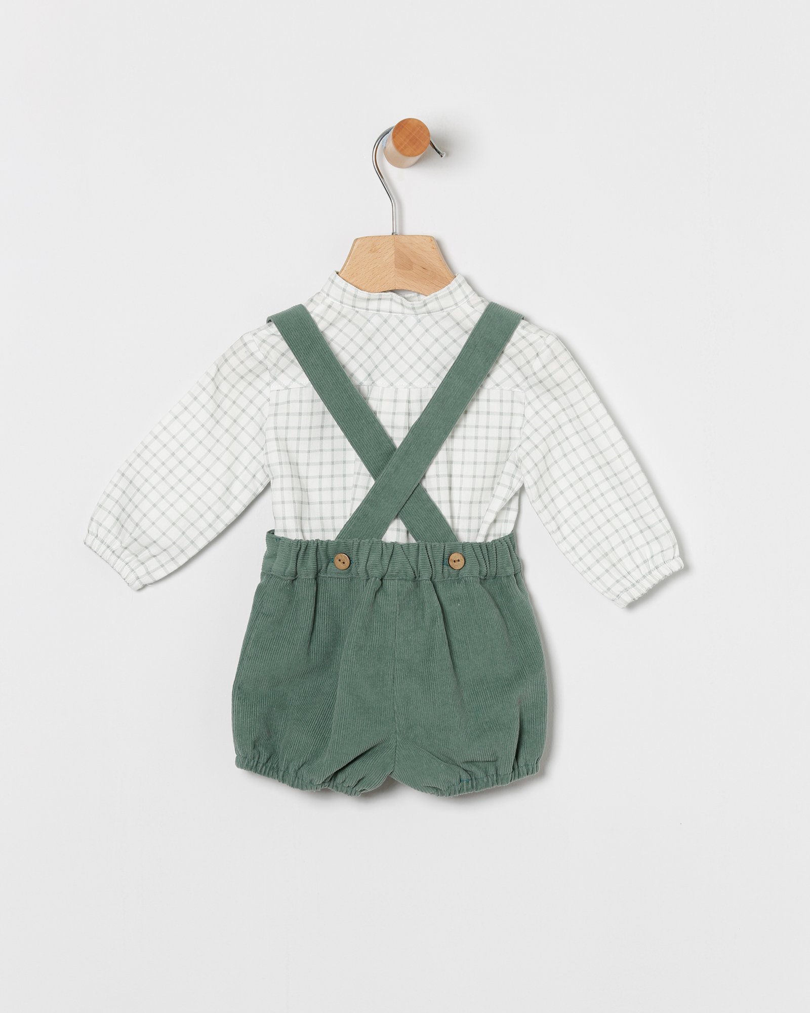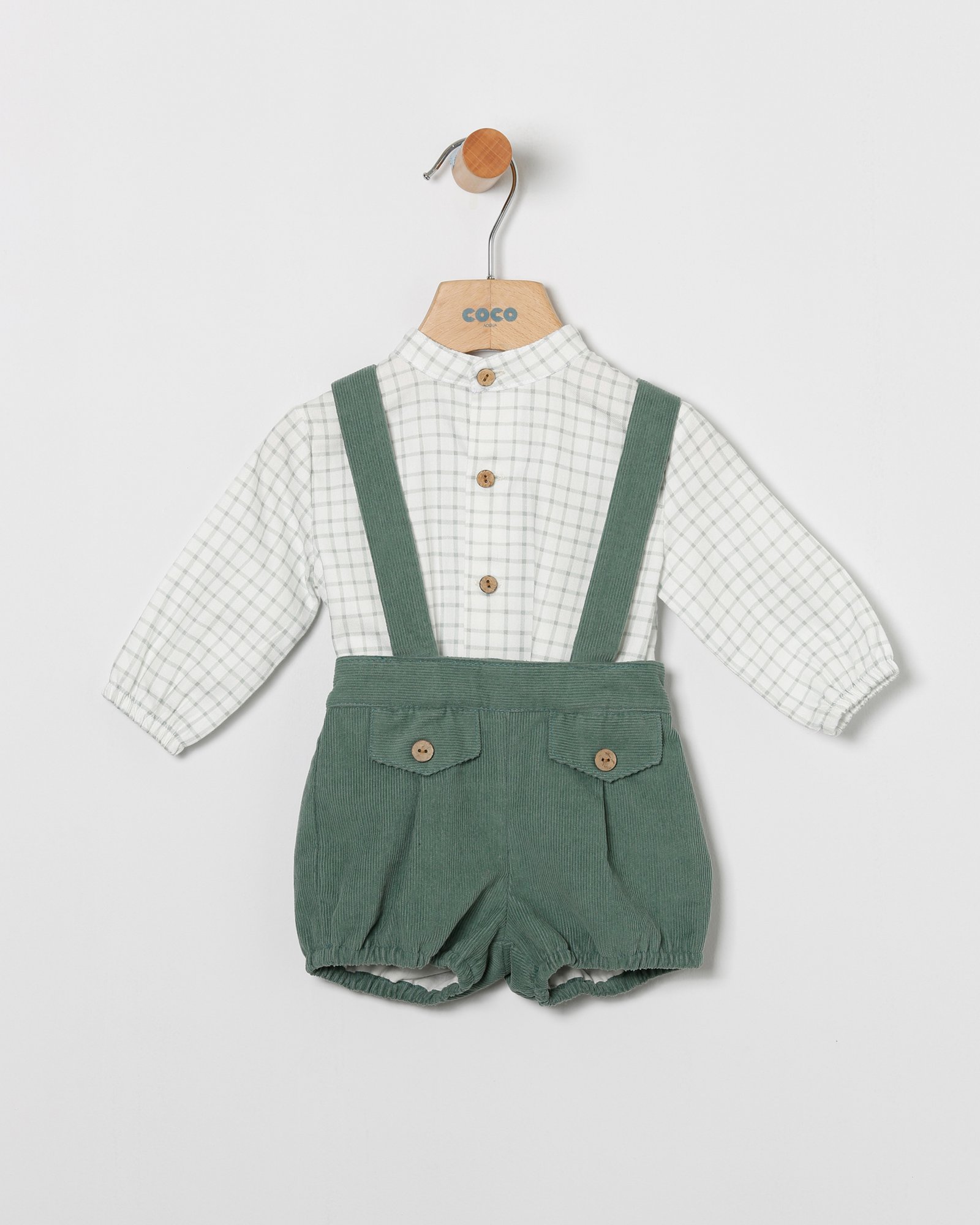 Conjunto de bebé niño formado por camisa blanca de cuadros en verde y peto de micro pana en color verde de la colección de Otoño-invierno 2025-2026 de Coco Acqua.