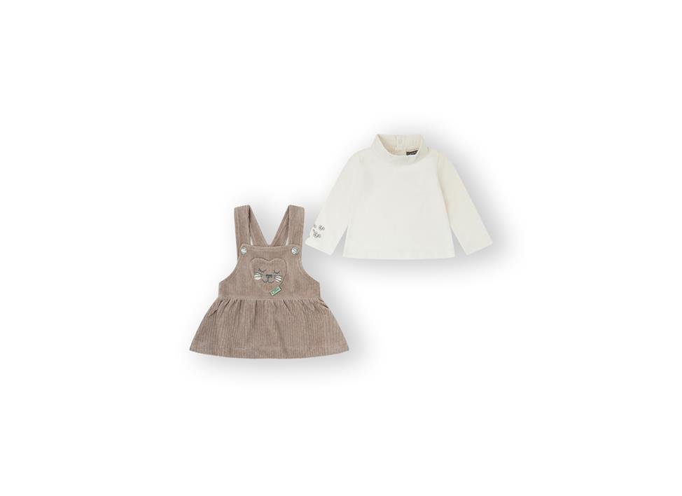 Conjunto peto de niña de la marca canada house, compuesto por jersey en color beige ¡y peto de micropana en marrón con dibujo de gatito.