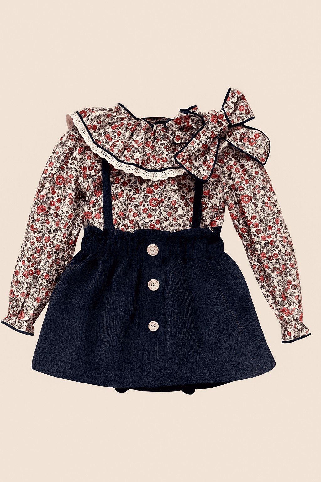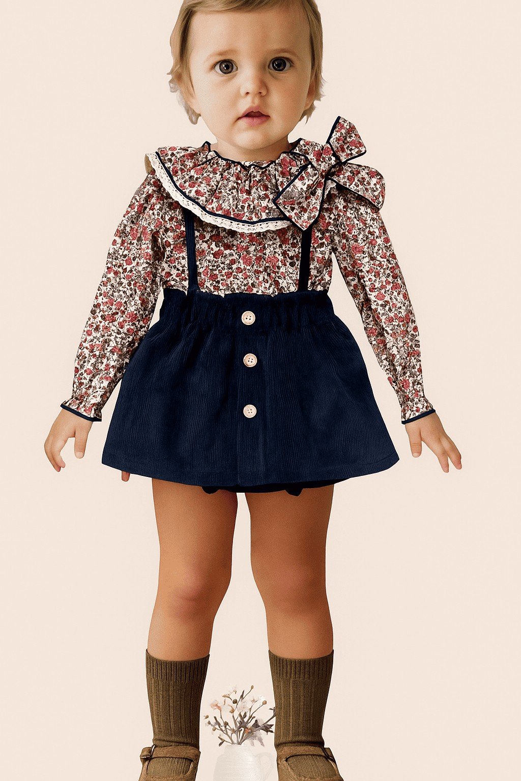 Conjunto 3 piezas borgoña formado por blusa en color borgoña estampada de flores y cuello volante con lazo y pichi falda en micro pana en color azul marino, también braguita de micro pana en azul marino a juego de la colección de Otoño-Invierno 2025-2026 de Valentina bebés.