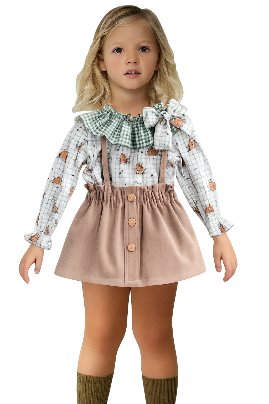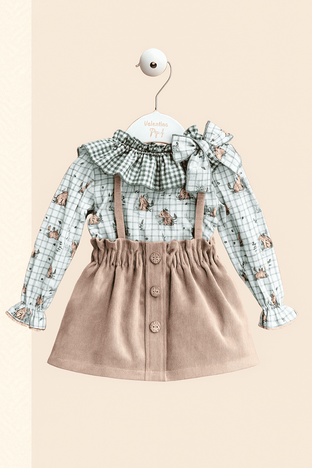 Conjunto 3 piezas Donatella formado por blusa en color verde y blanco estampada de animalitos y cuello volante vichy con lazo y pichi falda en micro pana en color azul beige, también braguita de micro pana a juego de la colección de Otoño-Invierno 2025-2026 de Valentina bebés.