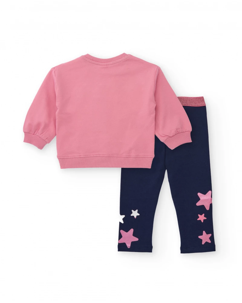Conjunto para niña compuesto por una sudadera en color rosa con un gran bordado de estrella en tonos rosa, blanco y azul marino, adornada con pequeños detalles bordados alrededor. Los leggings en azul marino presentan un alegre estampado de estrellas en diferentes colores, aportando un toque divertido y dinámico al conjunto. Fabricado en tejidos suaves y cómodos, es ideal para acompañar a las pequeñas en su día a día con estilo y comodidad.
