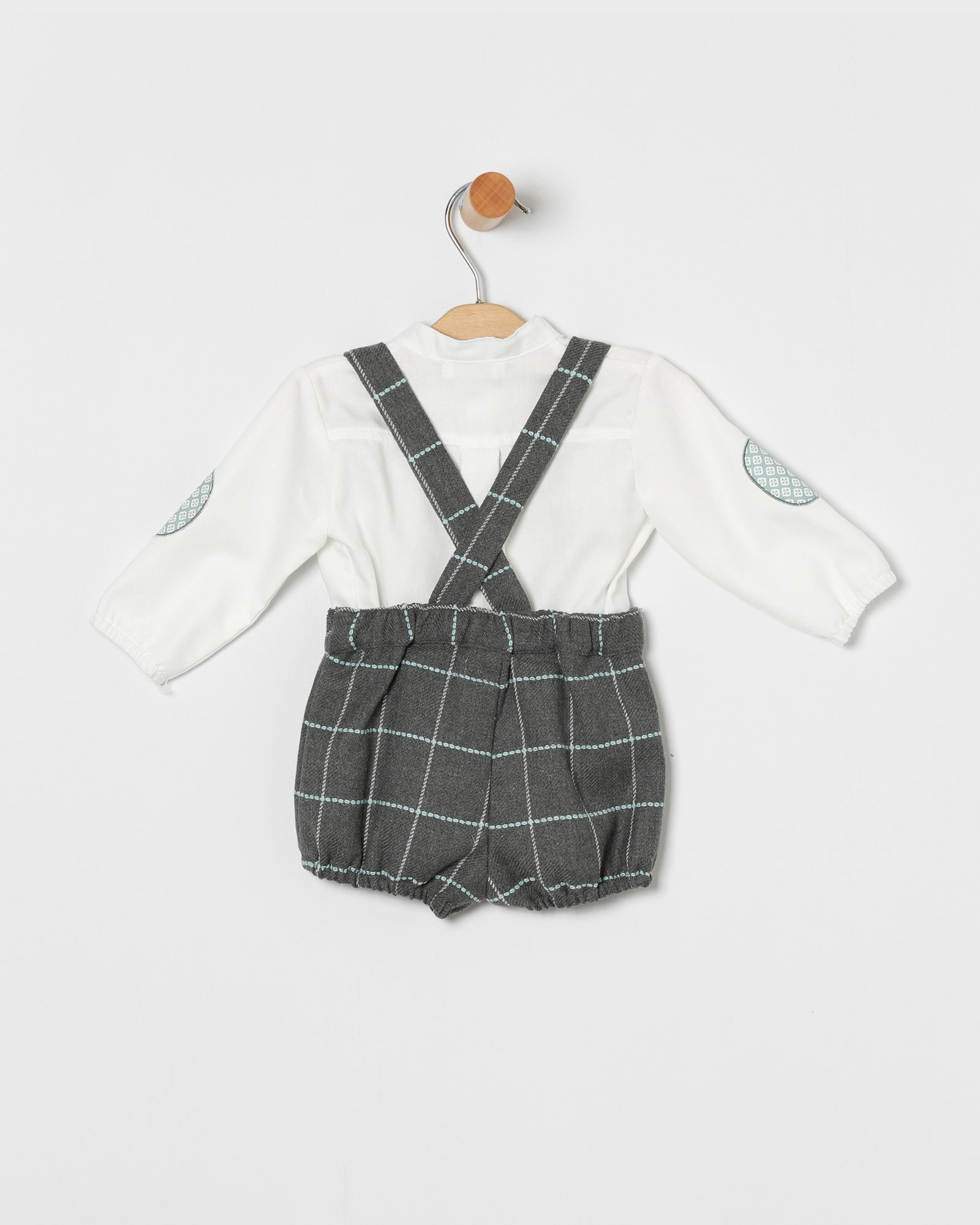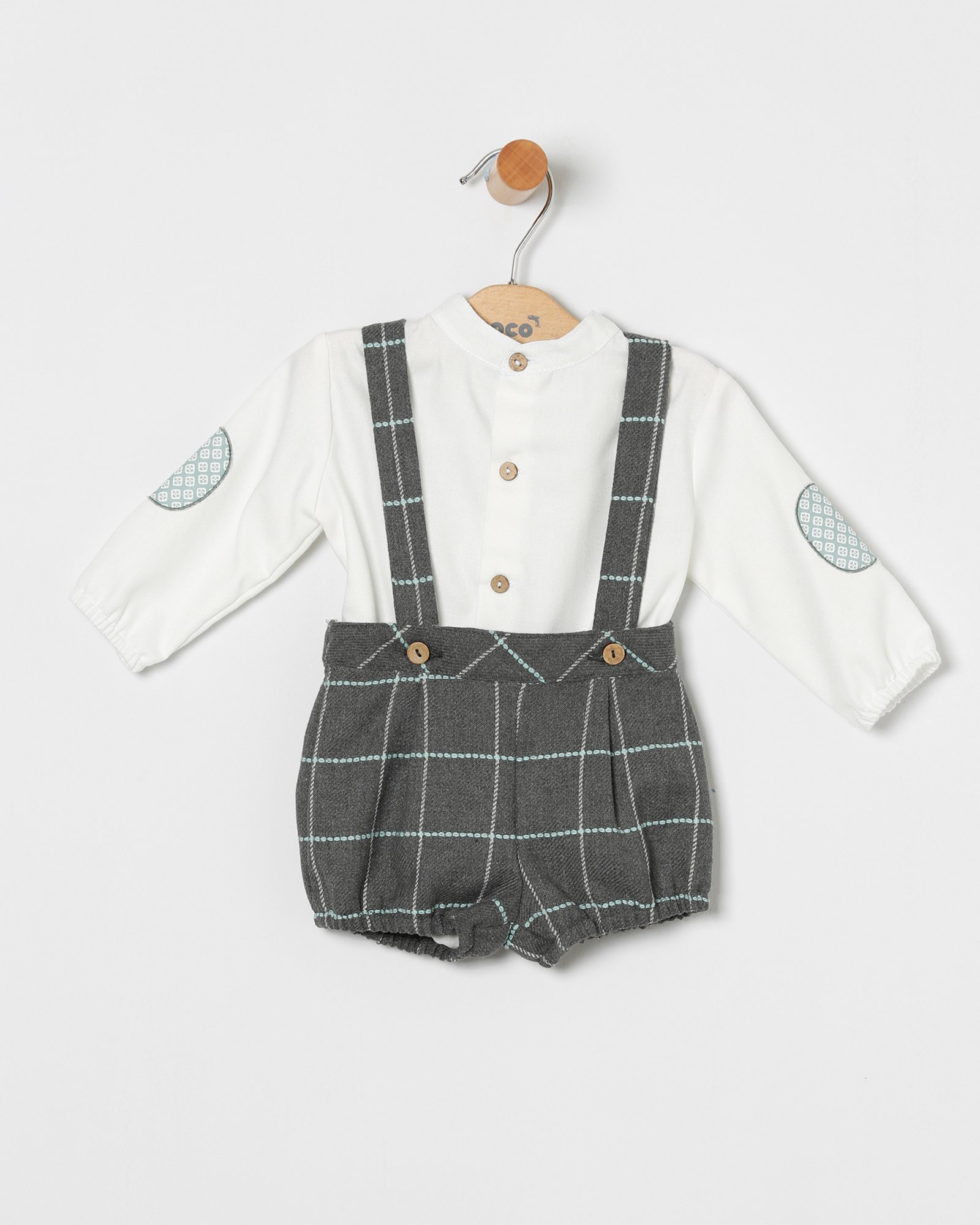 Conjunto de bebé niño formado por camisa blanca con coderas y peto de gris marengo de cuadros en verde agua de la colección de Otoño-invierno 2025-2026 de Coco Acqua.