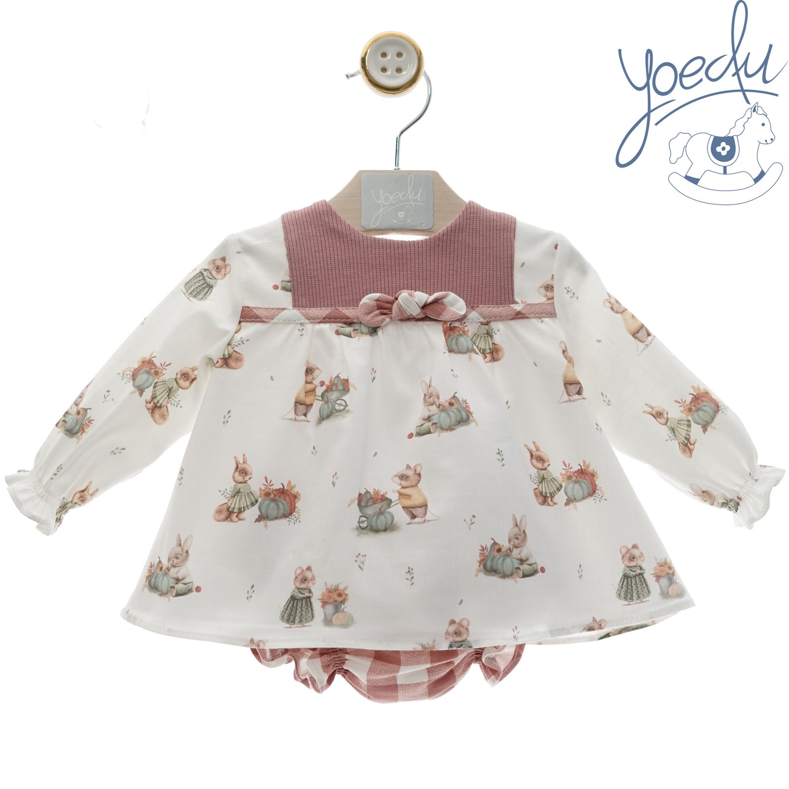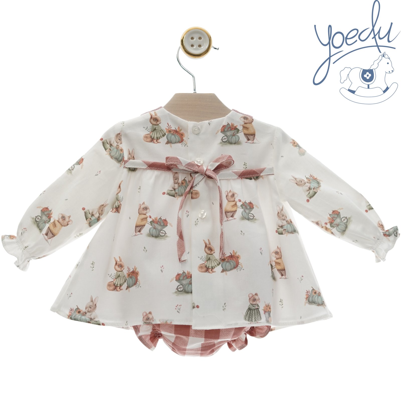 Confeccionado en tejido suave con un encantador estampado de animalitos, incluye vestidito, y braguita de cuadros vichy rosa.