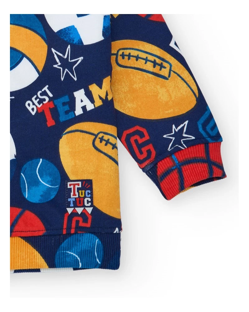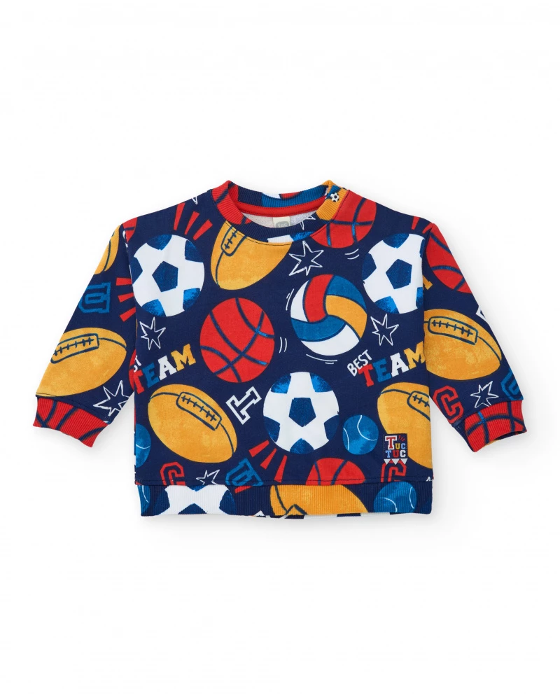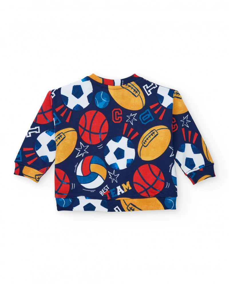 Sudadera de felpa para niño de color azul marino con un estampado integral de balones de fútbol, baloncesto, rugby y voleibol en colores vivos. Diseñada con cuello redondo, puños y bajo en canalé para un ajuste cómodo. Un diseño alegre y deportivo ideal para el día a día.