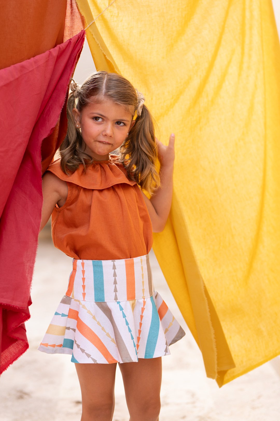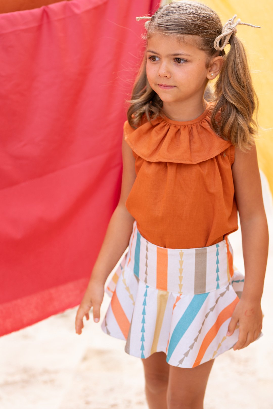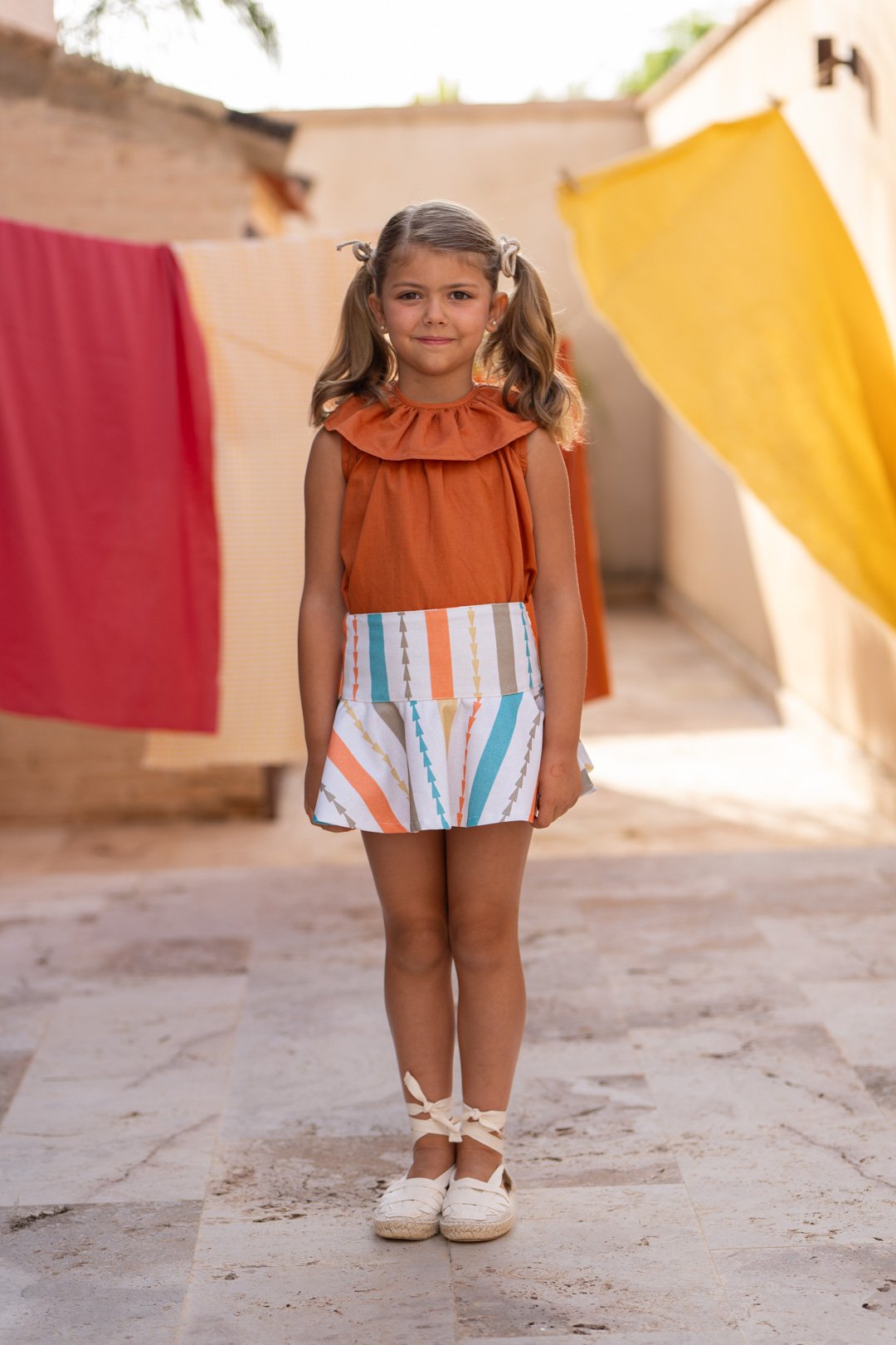 Conjunto infantil de dos piezas compuesto por blusa lisa en tono teja y falda multicolor estampada, una combinación llena de estilo y personalidad.