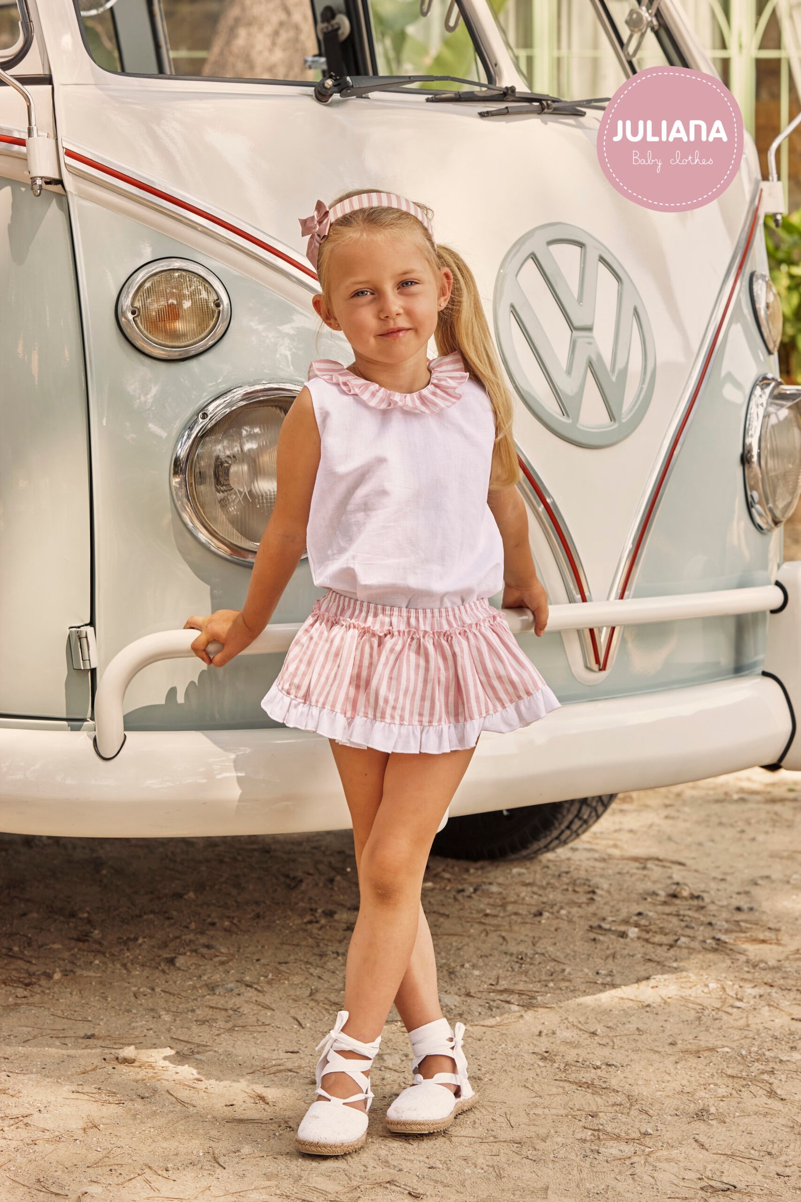 La blusa blanca sin mangas destaca por su delicado volante en el cuello con detalle de rayitas en tono rosa, aportando un aire dulce y elegante. La faldita de rayas rosa y blanco incorpora volante en el bajo y braguita a juego, garantizando comodidad y un ajuste perfecto gracias a su cintura elástica.