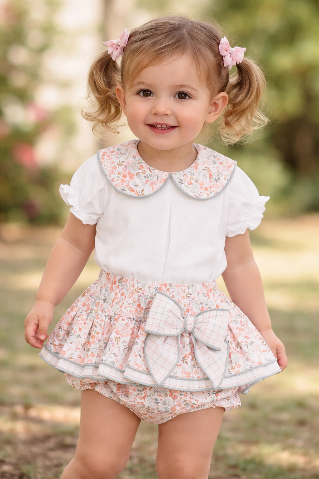 Conjunto de verano para bebé con un diseño fresco y alegre. la blusita blanca de algodón con un delicado cuello bebé estampado y la faldita (ranita) con estampado floral en tonos suaves con detalles en verde empolvado con un gran lazo lateral que aporta un toque sofisticado y original