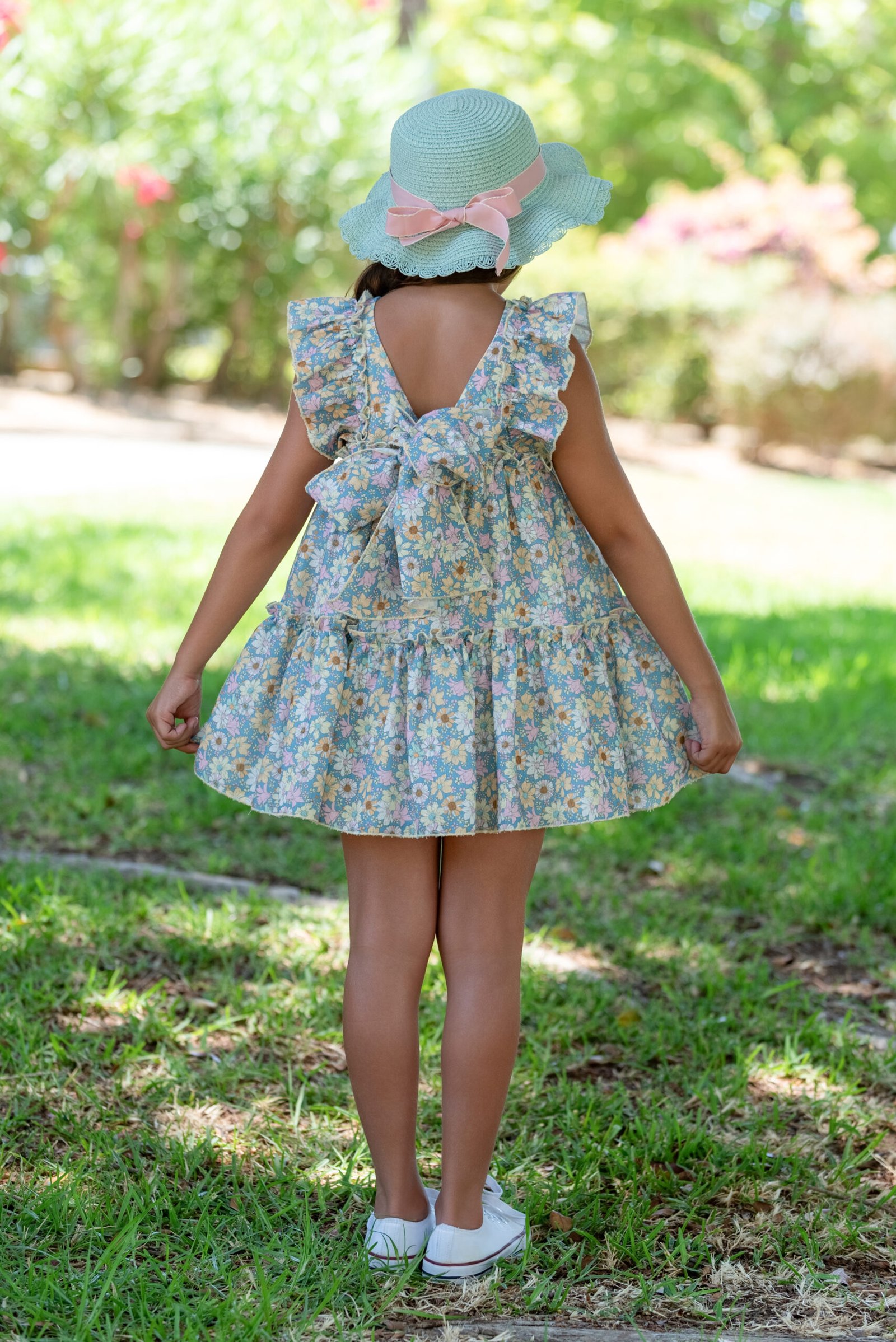 Vestido estampado floral en tonos amarillo y azul con cortes fruncidos y un precioso lazo en la espalda. Un vestido fresco, cómodo y lleno de encanto, ideal para los días de verano.